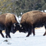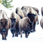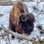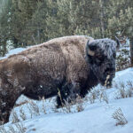 One of the most powerful images of Yellowstone is the American bison. These massive animals once nearly disappeared from the plains and mountains of the West, victims of relentless hunting in the nineteenth century. Seeing them today, moving slowly through deep snow with frost clinging to their shaggy coats, felt like witnessing a living symbol of resilience. Some stood motionless against the wind while others pushed forward through drifts, their dark forms striking against the white landscape.